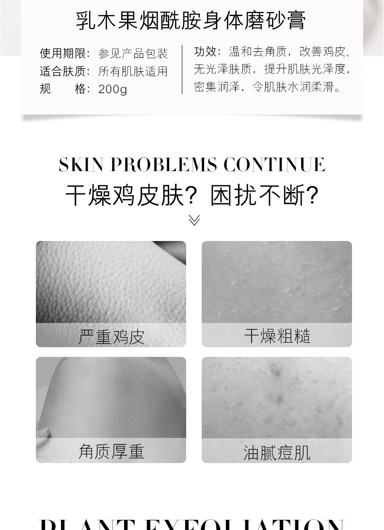 烟酰胺身体磨砂膏能有效抑制黑色素,改善暗沉,让肌肤水嫩光泽,它有很好的去角质和改善鸡皮的功效,还能起到抗氧化的效果,有效提亮肤色,深入肌底狙击黑色素,让肌肤嫩白透亮,双重磨砂颗粒,细腻温和,舒适更亲肤,按摩多久都不会感觉痛,不会伤害肌肤皮层,非常好用。