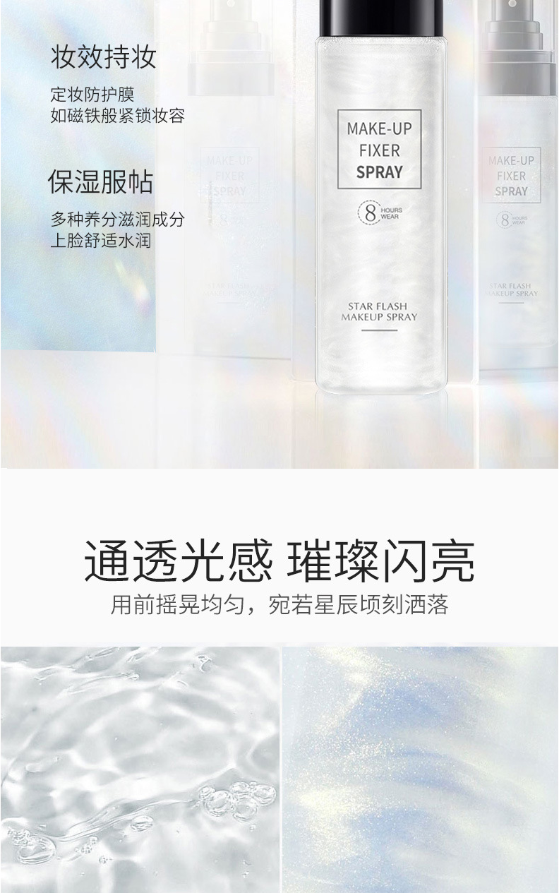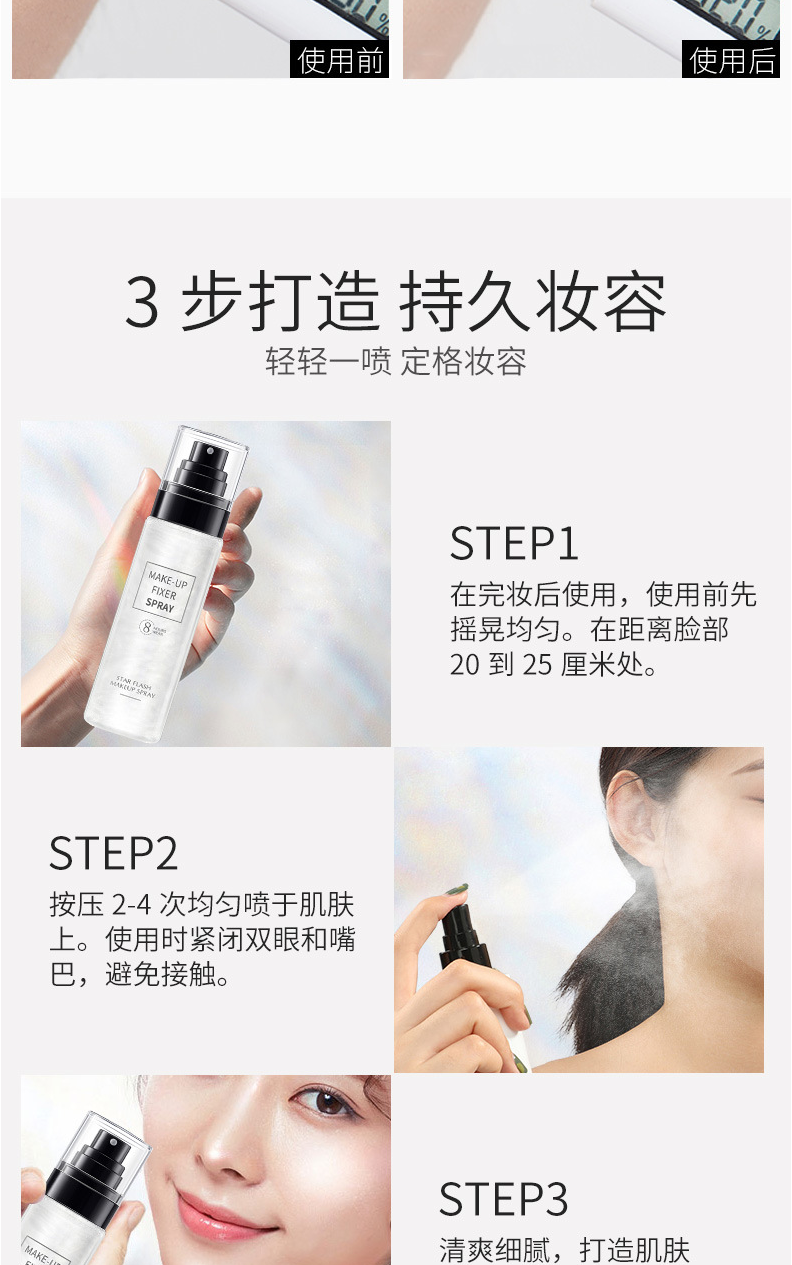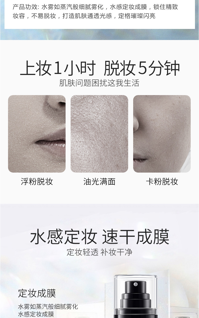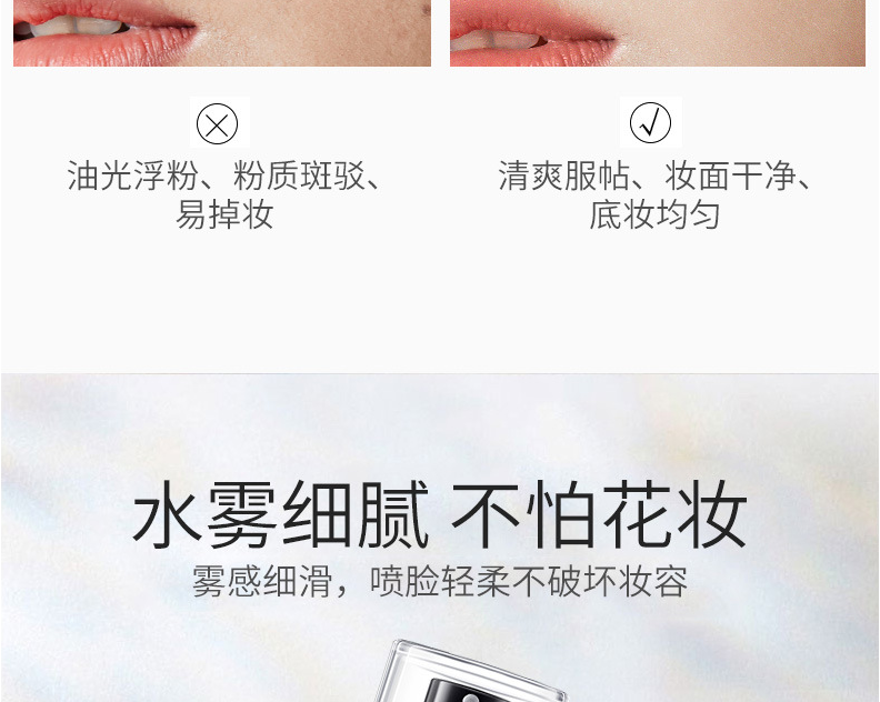 定妆喷雾是一种细腻的水雾,其水分可以使底妆变得服帖、通透、自然,富有光泽感,使用后可以使喷雾融进底妆,形成一层薄膜,增加底妆的持久性,它也可起到保湿、控油的作用,缓解皮肤干燥和粉质感,补充皮肤的水分,同时可以改善卡粉和一些底妆浮粉等问题,是一款非常实用的产品。