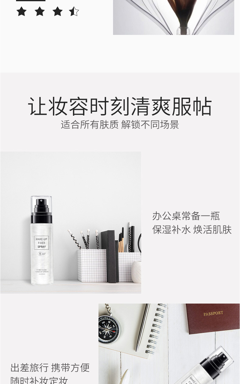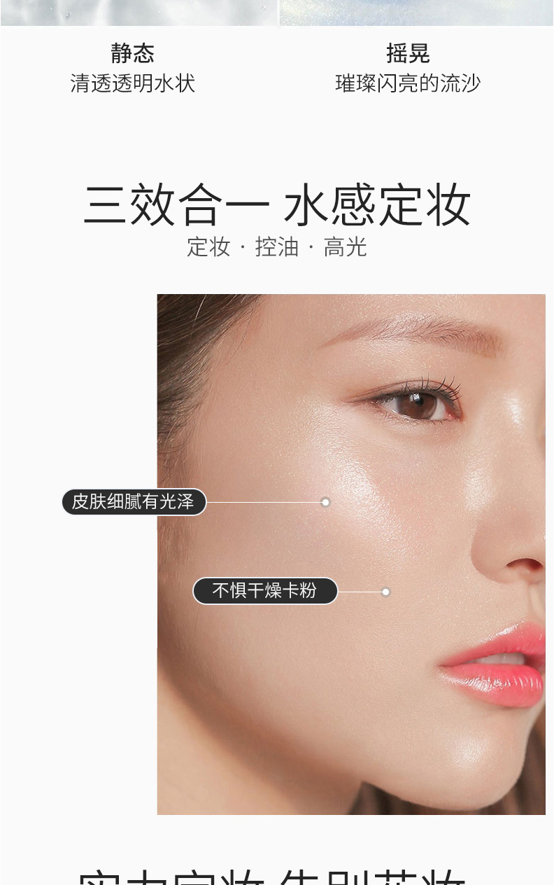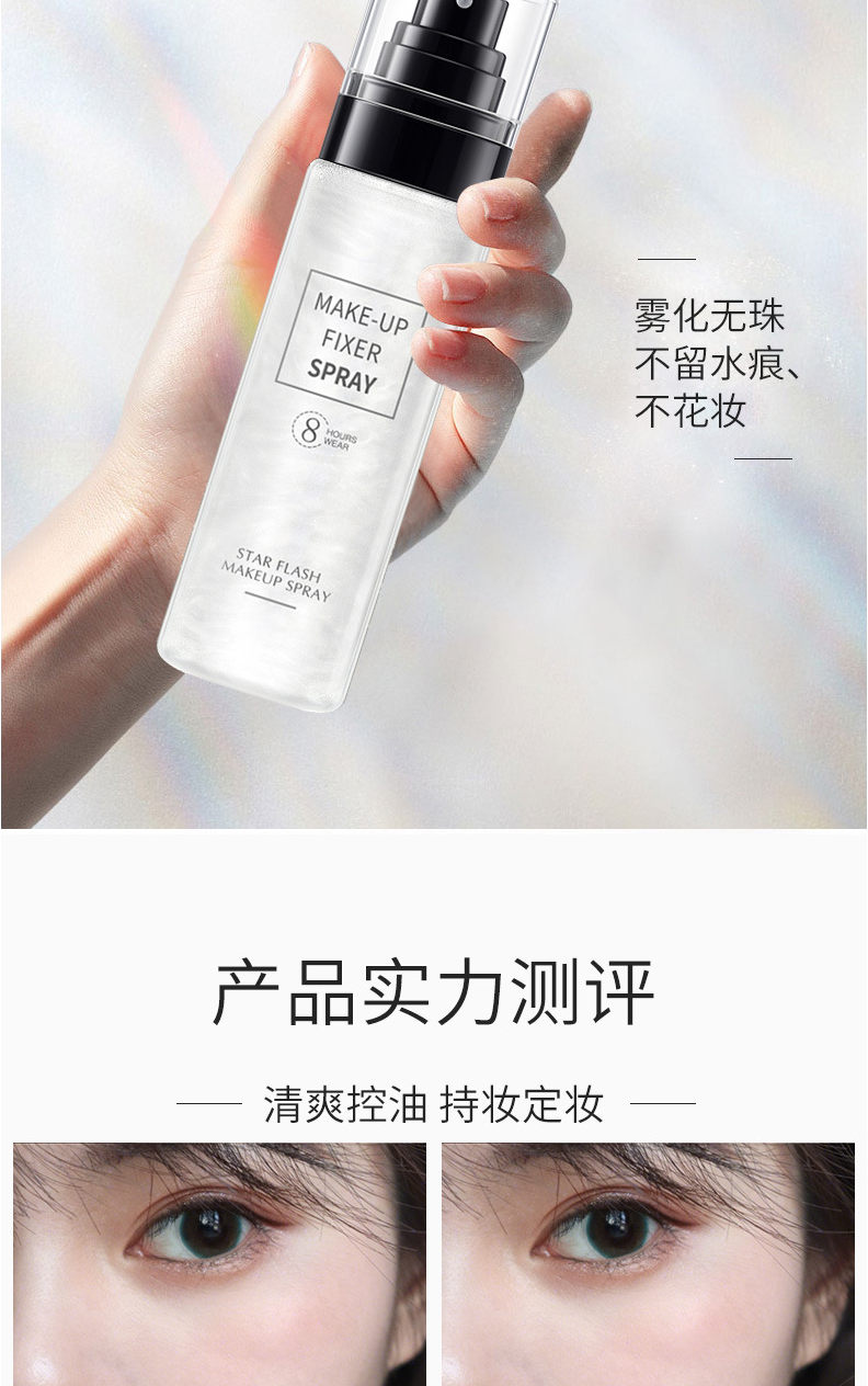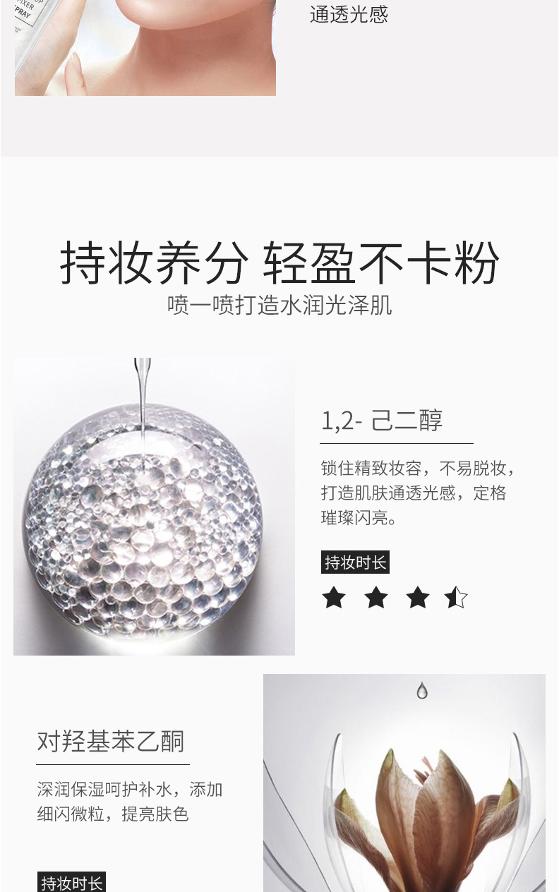 定妆喷雾是一种细腻的水雾,其水分可以使底妆变得服帖、通透、自然,富有光泽感,使用后可以使喷雾融进底妆,形成一层薄膜,增加底妆的持久性,它也可起到保湿、控油的作用,缓解皮肤干燥和粉质感,补充皮肤的水分,同时可以改善卡粉和一些底妆浮粉等问题,是一款非常实用的产品。