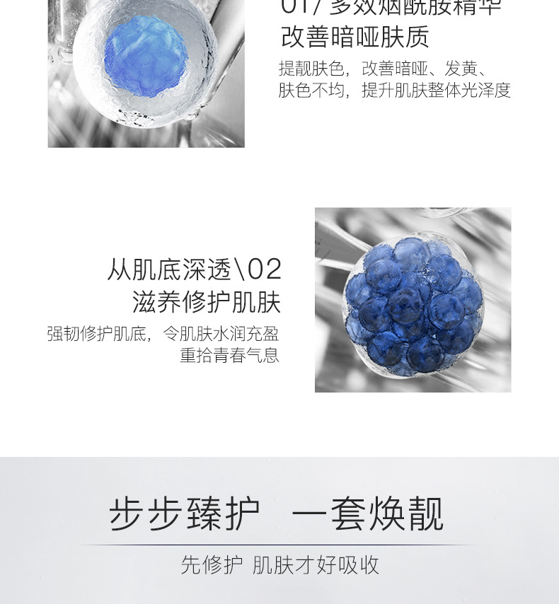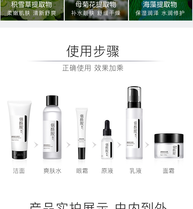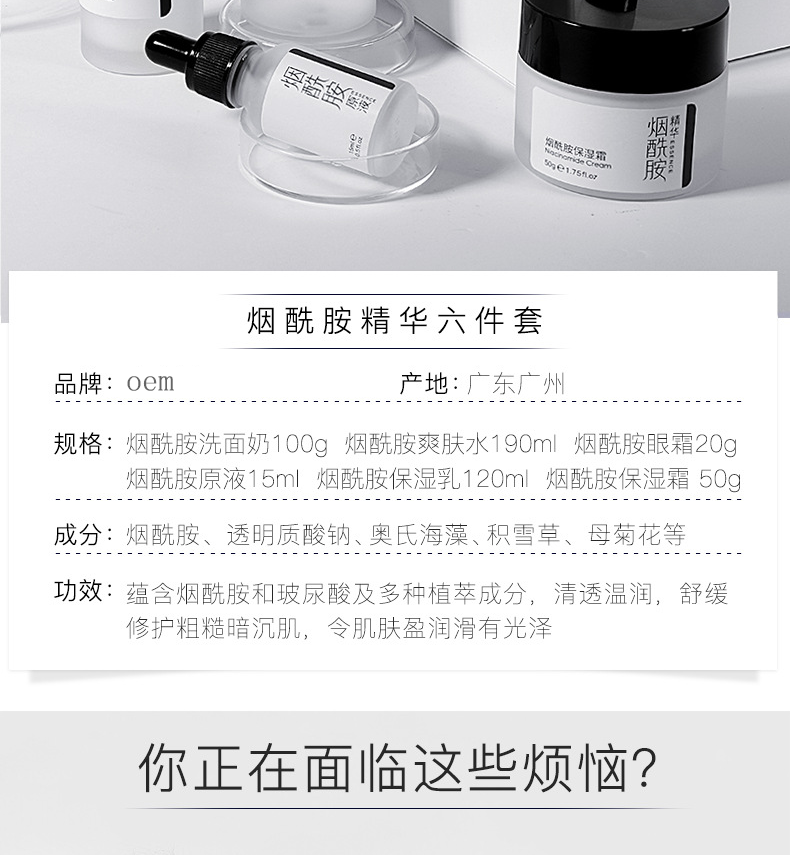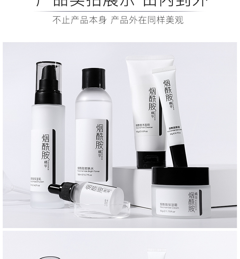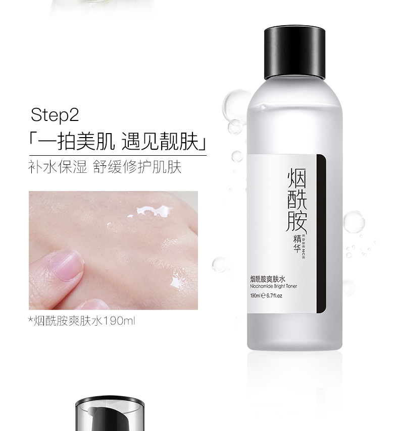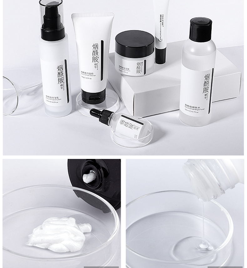 烟酰胺护肤品套装能针对性的满足肌肤美白、抗氧化等多种诉求,唤醒肌肤活力,能提亮肌肤整体亮度,有效改善暗沉肤色不均等,能防止水分流失,起到很好的保湿效果,这款产品主要是补充营养,锁住水分,轻薄清爽质地,清爽不油,夏天也不用担心油腻,里面的烟酰胺护肤成分可深入肌肤,让我们的皮肤畅快呼吸。详细内容